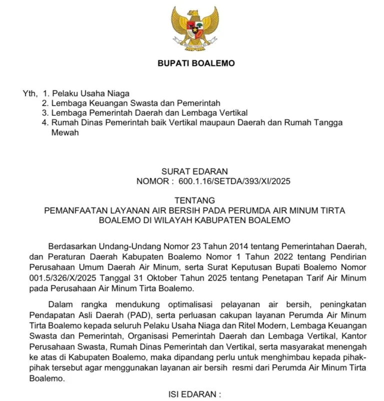 Erapena.com- Dalam upaya meningkatkan pelayanan publik dan memperluas cakupan distribusi air bersih di Kabupaten Boalemo, Bupati Boalemo resmi mengeluarkan Surat Edaran Nomor 600.1.16/SETDA/393/XI/2025 tentang Pemanfaatan Layanan Air Bersih pada Perumda Air Minum Tirta Boalemo.
