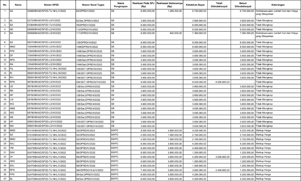 Dari total dugaan kelebihan bayar tersebut, disebutkan baru sekitar Rp31,8 juta yang telah ditindaklanjuti. Data yang beredar juga memuat secara rinci nama-nama pihak yang terlibat serta nomor Surat Perintah Pencairan Dana (SP2D).