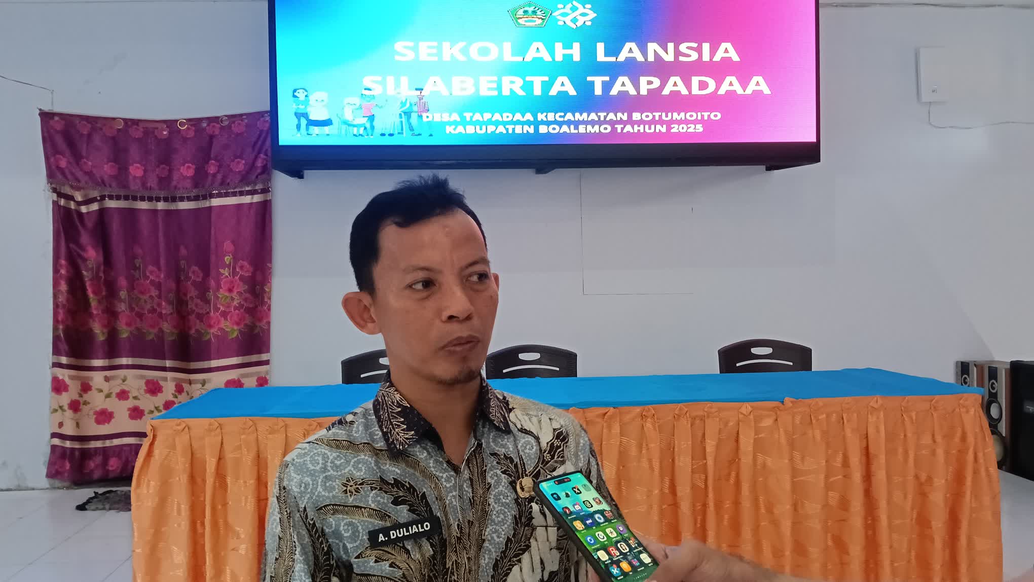 Kepala Dinas DPPKBP3A Kabupaten Boalemo, Agus Dulialo S.STP., M.M., menyampaikan apresiasinya atas launching Sekolah Lansia di desa Tapadaa tersebut.