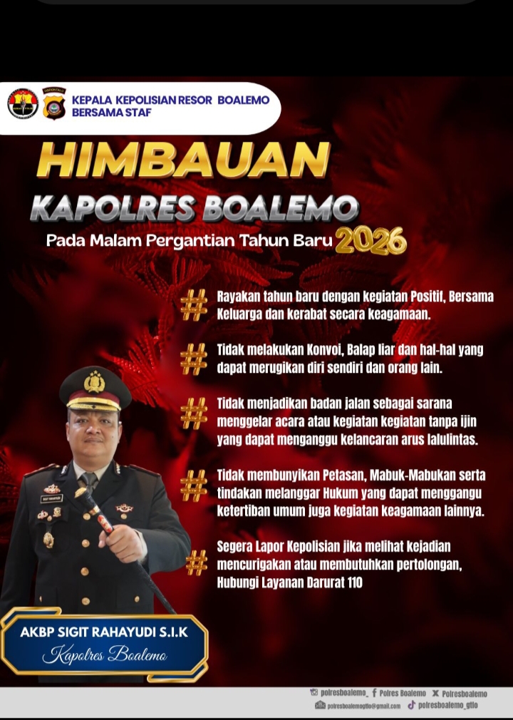 Erapena.com- Menjelang perayaan malam pergantian Tahun Baru, Kepolisian Resor (Polres) Boalemo mengeluarkan sejumlah imbauan kepada masyarakat guna menjaga situasi keamanan dan ketertiban masyarakat (kamtibmas) tetap aman dan kondusif.