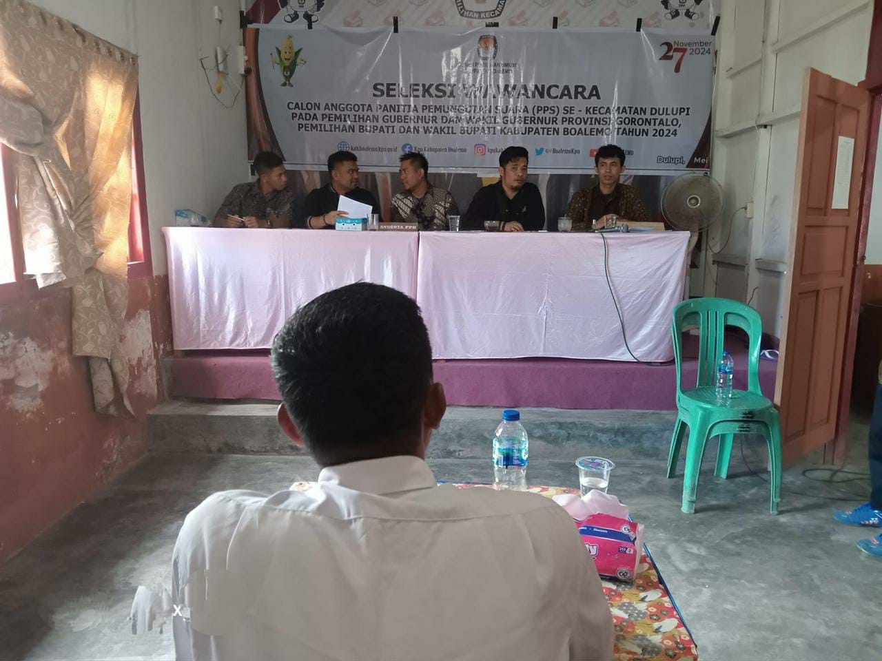 ERAPENA.COM- Panitia Pemilihan Kecamatan (PPK) Dulupi, Kabupaten Boalemo, Gorontalo, menggelar tes wawancara kepada calon Anggota Panitia Pemungutan Suara (PPS) pada Pilkada 2024, bertempat di Sekretariat PPK, Rabu 22 Mei 2024.