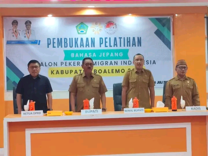Erapena.com- Dinas Tenaga kerja dan Transmigrasi Kabupaten Boalemo menggelar pelatihan Bahasa Jepang bagi calon pekerja Migran Indonesia Kabupaten Boalemo, bertempat hotel Grand Amalia, Senin, 14 Juli 2025.